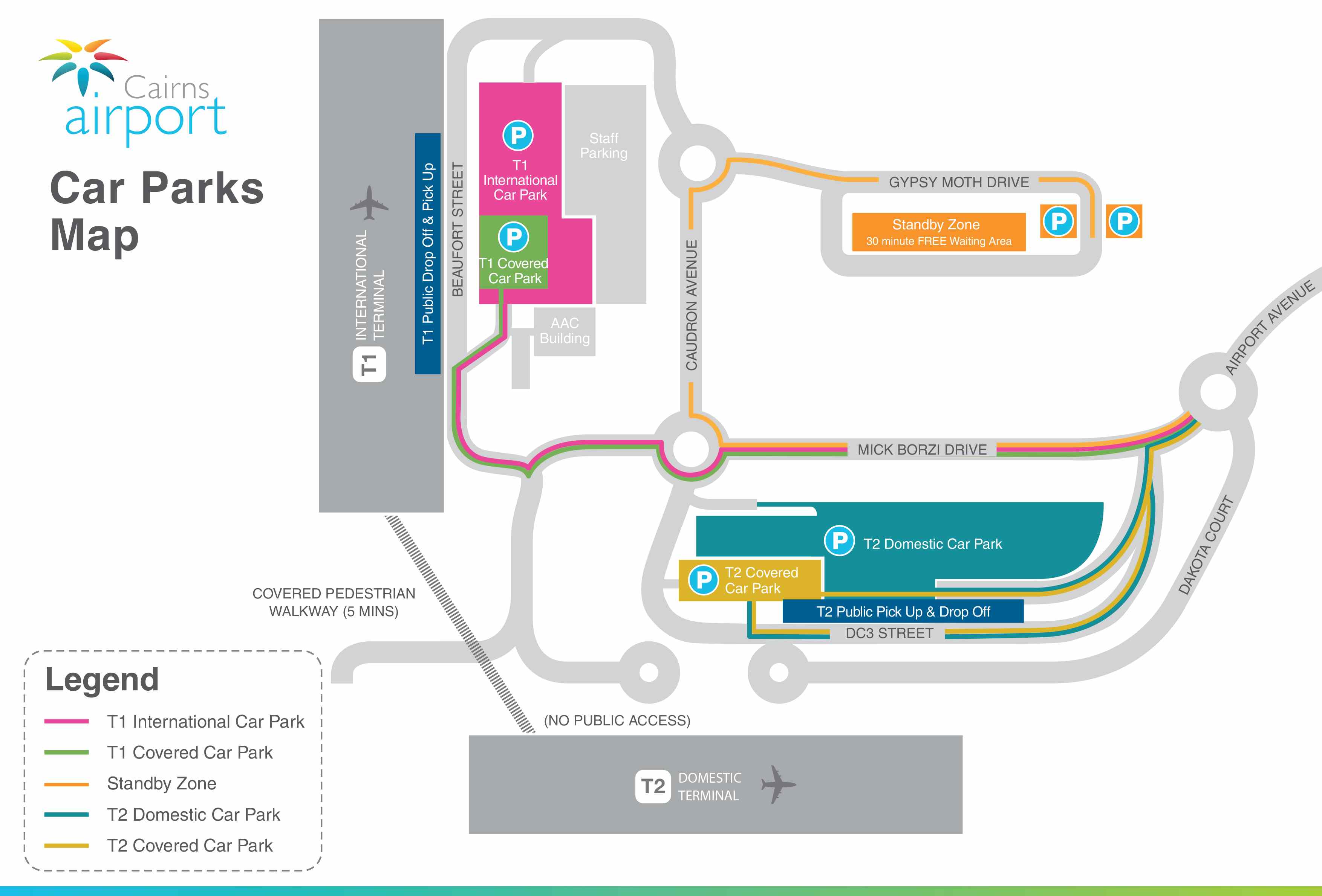 As you enter Cairns Airport follow the pink 'T1 Car Park' signs towards the International Terminal. The entry to the T1 Car Park is on Beaufort Street across the road from the T1 International Terminal.